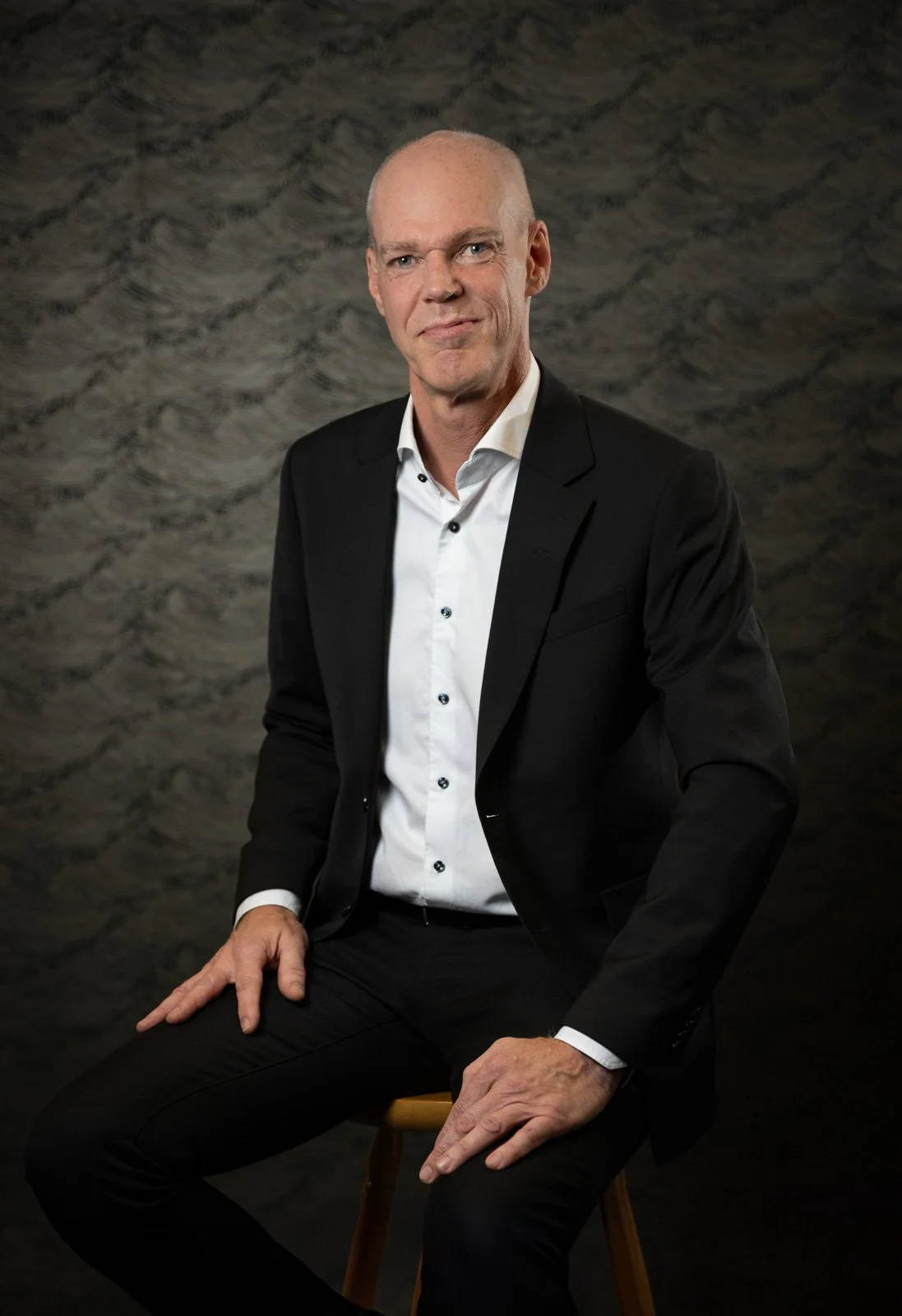 Person with short hair and glasses in black clothing, smiling and standing with folded arms against a dark background.