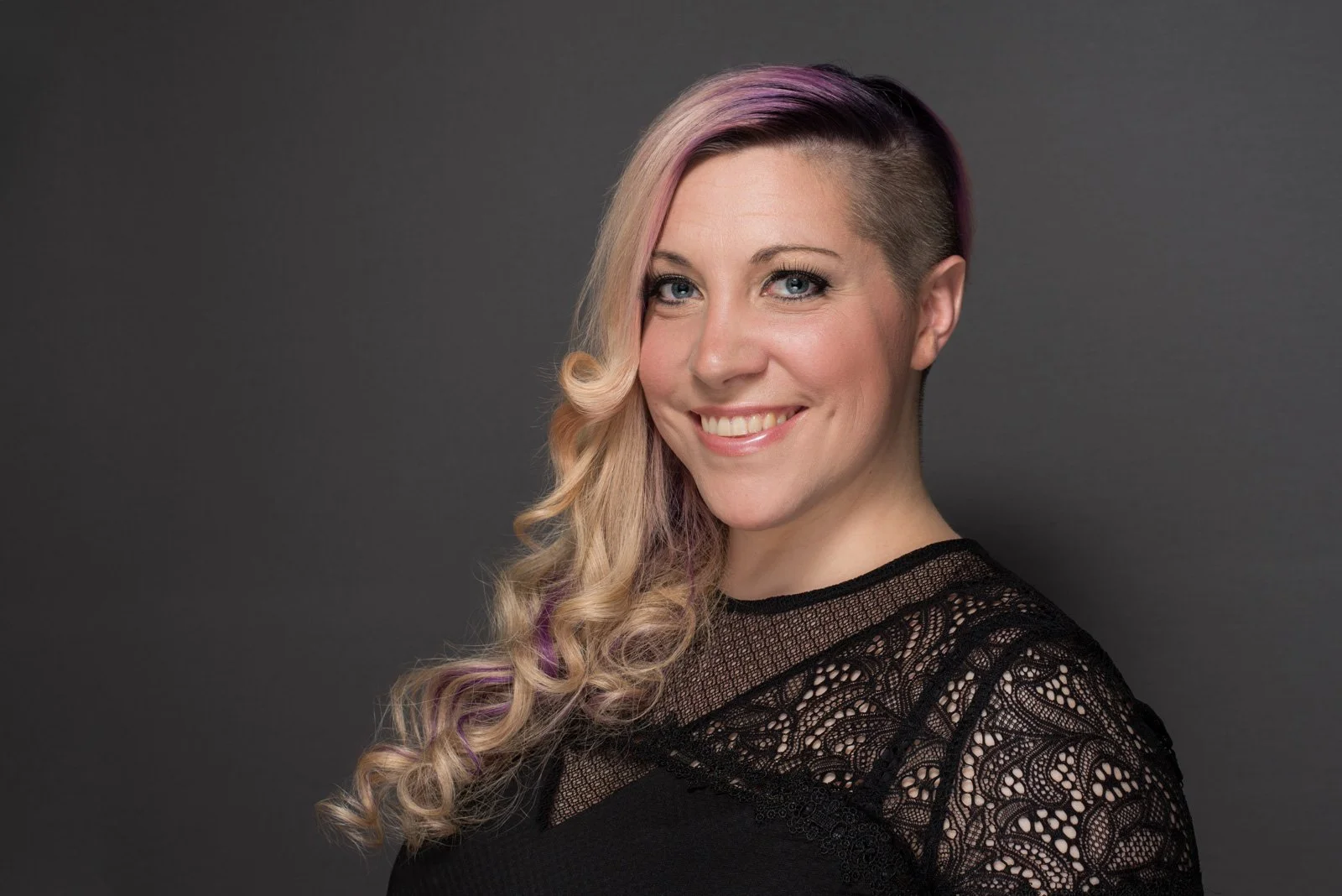 Person with short hair and glasses in black clothing, smiling and standing with folded arms against a dark background. View fullsize